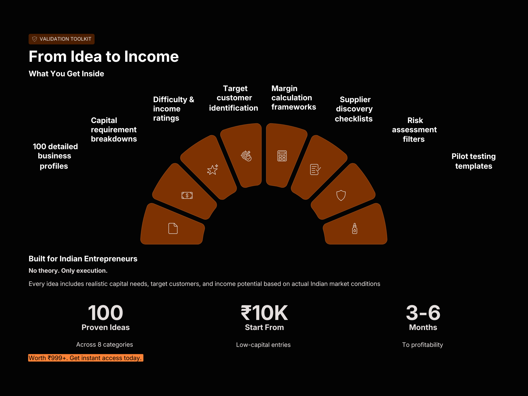 The Buy Low, Sell Smart: 100 High-Margin Commerce Ideas by VyaparKit is a practical guide designed to help entrepreneurs discover profitable low-capital trading opportunities in India’s fast-moving marketplace. Many beginners lose ₹25,000–₹2 lakhs simply because they choose the wrong products, rely on social media trends, or enter capital-heavy businesses without a clear strategy. This VyaparKit playbook solves that problem by presenting 100 carefully selected high-margin commerce ideas that focus on buying smart, selling strategically, and maximizing profit with minimal investment. Inside the guide, each opportunity is broken down with clear capital requirements, difficulty levels, potential income ranges, and real-world market insights tailored for Indian entrepreneurs. The playbook also includes practical tools such as target customer identification methods, margin calculation frameworks, supplier discovery checklists, risk assessment filters, and pilot testing templates. Instead of wasting months on trial and error, the VyaparKit Buy Low, Sell Smart guide helps you validate ideas faster, choose the right opportunity for your budget, and build a profitable commerce business with confidence.