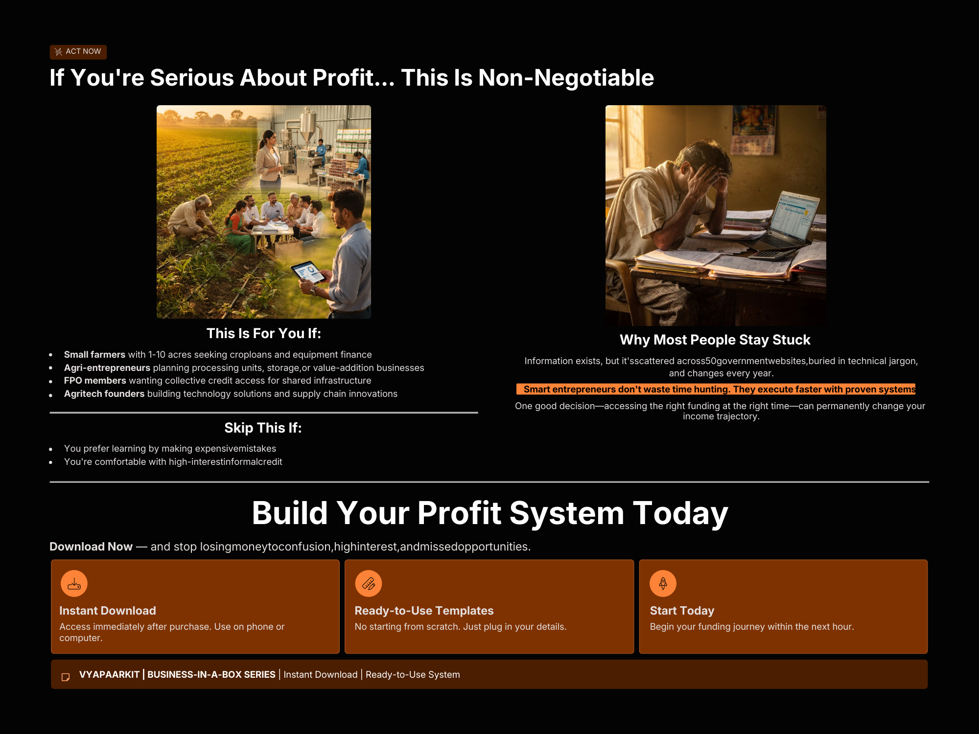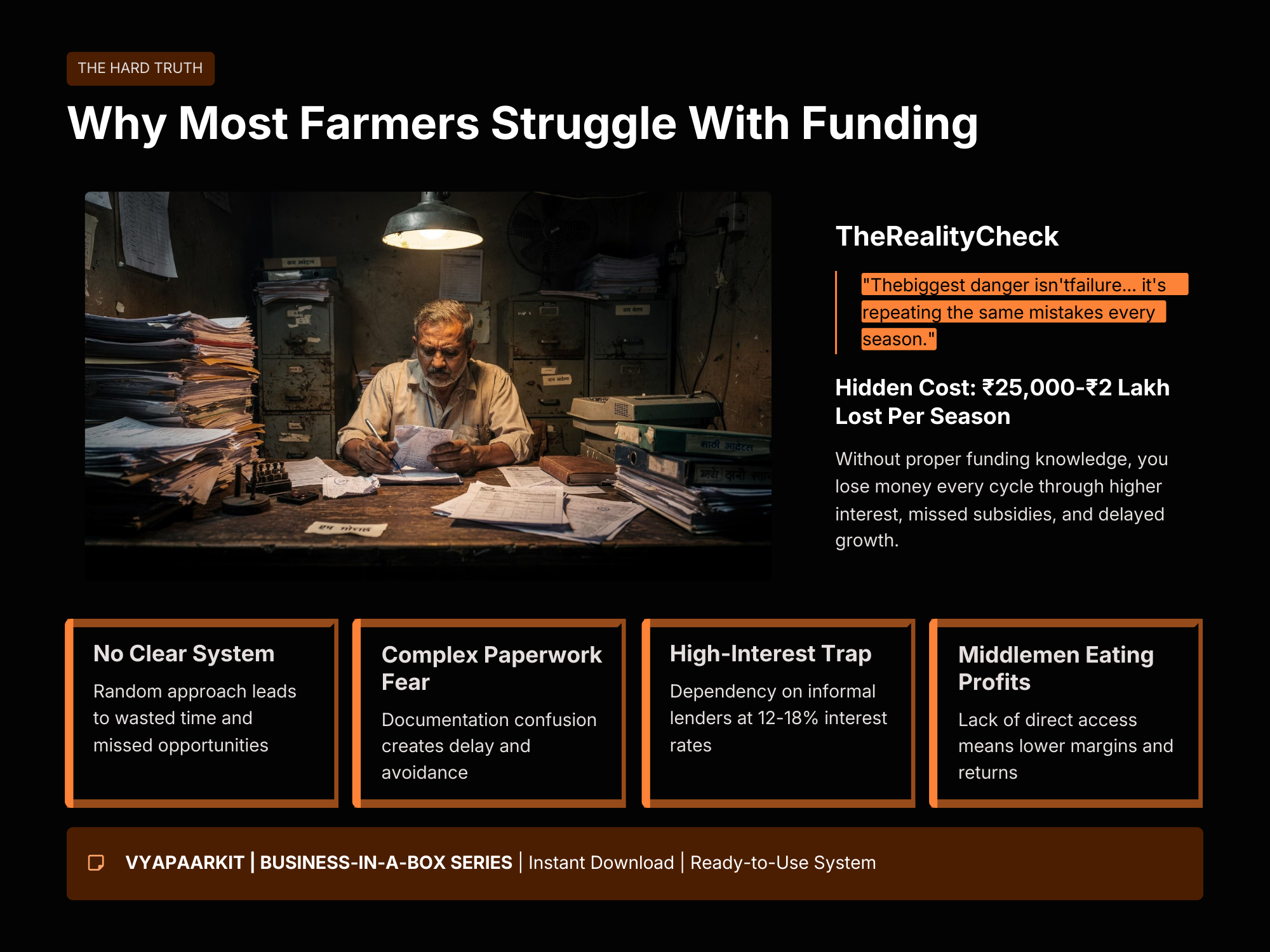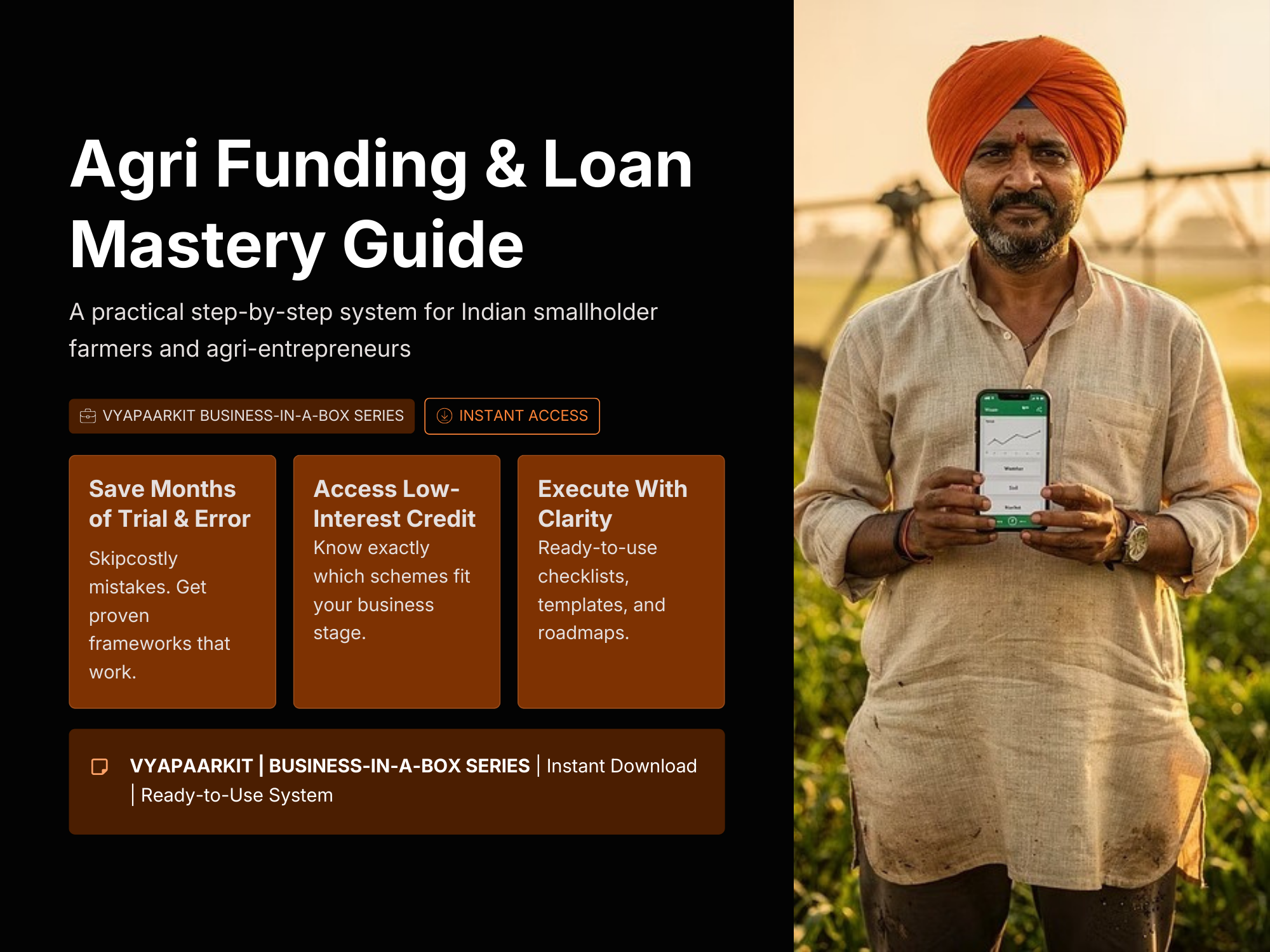 The Agri Funding & Loan Mastery Guide by VyaparKit is a practical step-by-step system designed to help Indian farmers and agri-entrepreneurs access the right funding without confusion, delays, or high-interest traps. Many farmers lose ₹25,000 to ₹2,00,000 every season due to missed subsidies, complex paperwork, and dependence on informal lenders charging high interest. This guide simplifies the entire funding process by showing you how to identify the right government schemes, prepare proper documentation, and secure low-interest agricultural loans with confidence. Inside the playbook, you’ll learn how to navigate crop loans, equipment financing, agri-infrastructure funding, and subsidy programs while avoiding common mistakes that slow down approvals. With clear checklists, ready-to-use templates, and structured roadmaps, this VyaparKit system helps farmers save months of trial and error and execute funding strategies with clarity. Whether you are a smallholder farmer, FPO member, agri-startup founder, or someone planning a value-added agriculture business, this guide gives you a reliable blueprint to access capital and build a profitable agricultural enterprise.