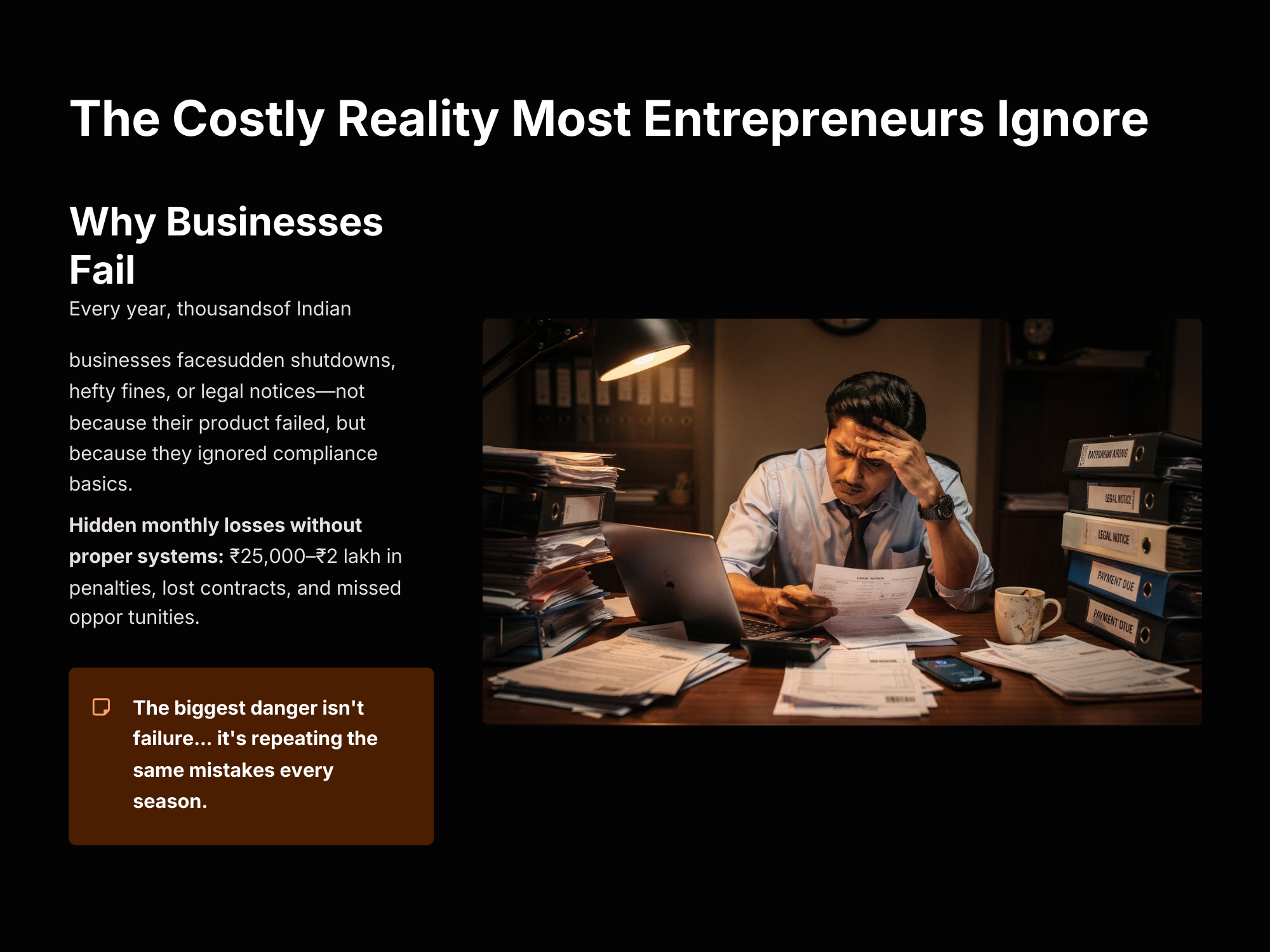 The Business Compliance & Legal Setup Playbook by VyaparKit is a practical step-by-step system designed to help entrepreneurs avoid costly legal mistakes and build a fully compliant business from the start. Every year, thousands of Indian businesses face unexpected shutdowns, penalties, legal notices, and lost contracts—not because their products failed, but because they ignored essential compliance requirements. Without proper systems, businesses can lose ₹25,000 to ₹2 lakh per month in penalties, missed opportunities, and operational delays.
