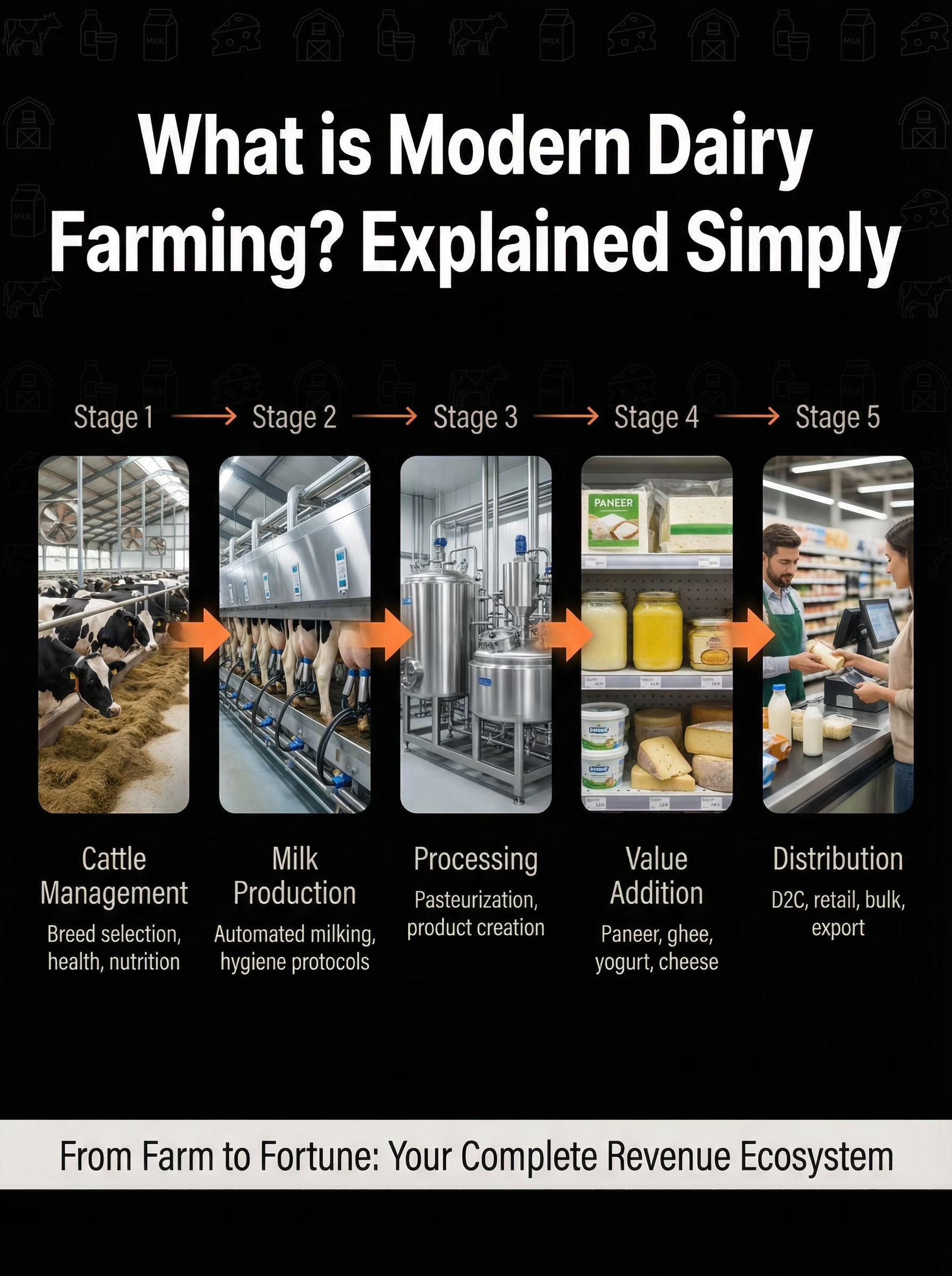 This plan explains how modern dairy farming uses science, not luck. You’ll learn how breed selection, nutrition cycles, and veterinary planning dramatically increase milk yield compared to traditional methods. This alone can improve profitability by 30–50% without increasing herd size.