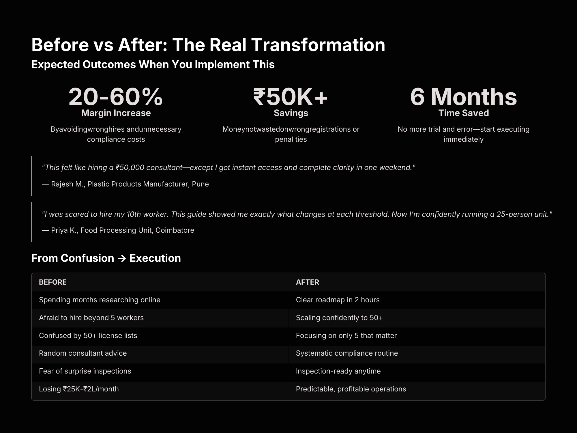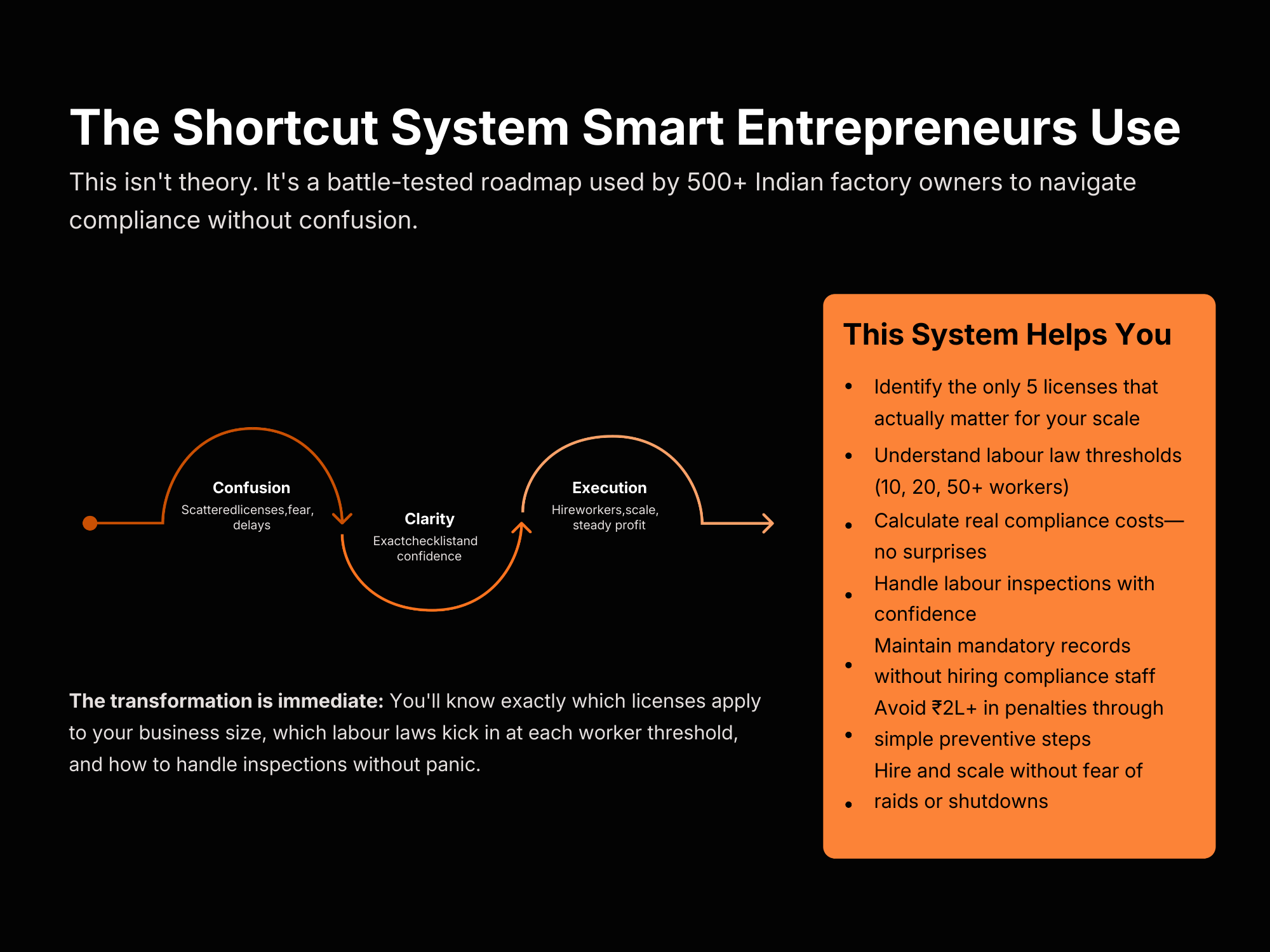 The Factory Compliance & Licensing Roadmap Blueprint by VyaparKit is a practical guide designed to help manufacturing entrepreneurs navigate complex licenses, labour laws, and regulatory requirements without confusion or costly mistakes. Many factory owners lose months researching dozens of registrations online, hire expensive consultants, or delay hiring workers due to fear of inspections and penalties. This blueprint simplifies the entire compliance process by showing exactly which licenses actually matter for your factory size, industry, and workforce stage. Inside, you’ll learn how labour law thresholds work, which registrations are mandatory at different worker counts, how to maintain required compliance records, and how to handle labour inspections confidently. Instead of spending money on unnecessary registrations or risking surprise penalties, this system provides a clear checklist-based roadmap used by hundreds of Indian manufacturing founders. By implementing these frameworks, you can hire and scale your workforce without fear, avoid ₹2 lakh+ compliance mistakes, and build a factory operation that is legally protected and ready for long-term growth.