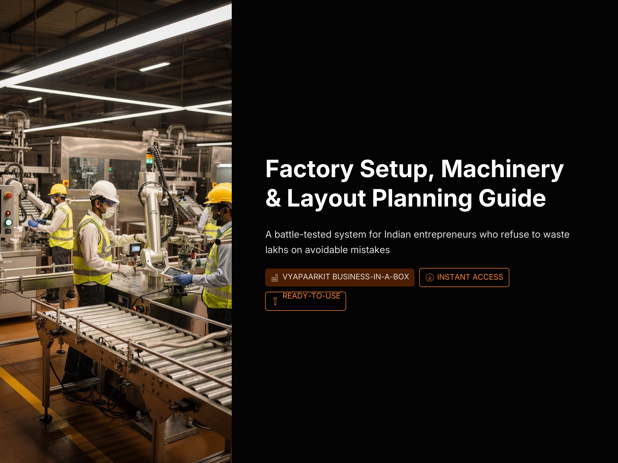 The Factory Setup, Machinery & Layout Planning Guide by VyaparKit is a practical, step-by-step blueprint designed to help entrepreneurs start and scale a manufacturing business without wasting lakhs on costly mistakes. Many first-time manufacturers struggle with poor factory layout planning, buying the wrong machinery, delays in permits, and inefficient production workflows that reduce profitability. This VyaparKit Business-in-a-Box guide simplifies the entire process by providing a structured roadmap to plan, launch, and scale a factory with confidence.