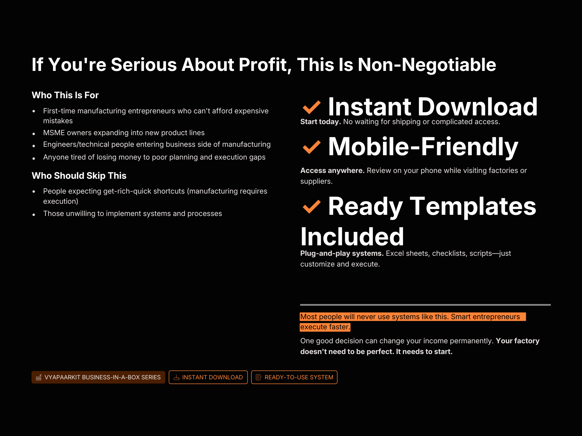 Inside this system, you’ll learn how to validate product ideas, choose the right machinery for your production goals, design an efficient factory layout, and set up operations that maximize productivity while minimizing waste. The guide also includes practical frameworks used by successful Indian manufacturers across industries such as food processing, textiles, consumer goods, and auto components.