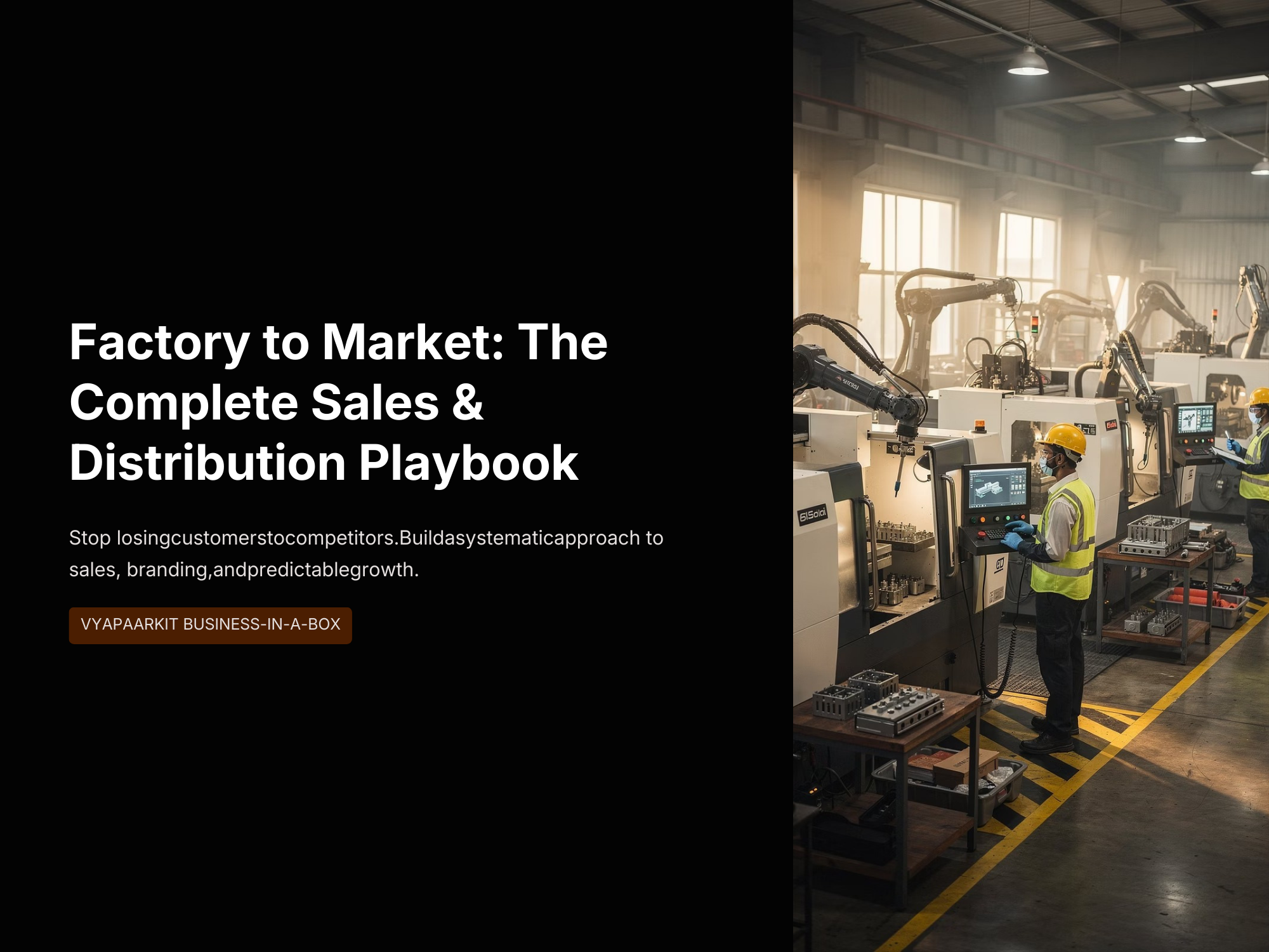 The Factory to Market: Complete Sales & Distribution Playbook by VyaparKit is a practical system designed to help manufacturers turn production into predictable sales and scalable market reach. Many factories struggle not because they can’t produce, but because they lack a structured sales and distribution strategy. Products sit in warehouses, competitors capture dealers and distributors, and marketing budgets are wasted on low-quality leads. This VyaparKit Business-in-a-Box playbook provides a clear framework to move from factory production to consistent market demand.