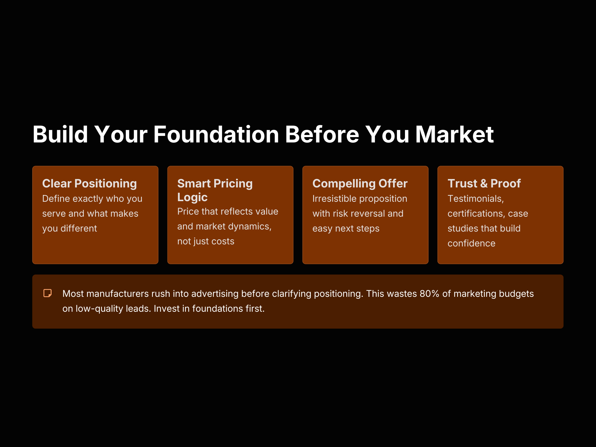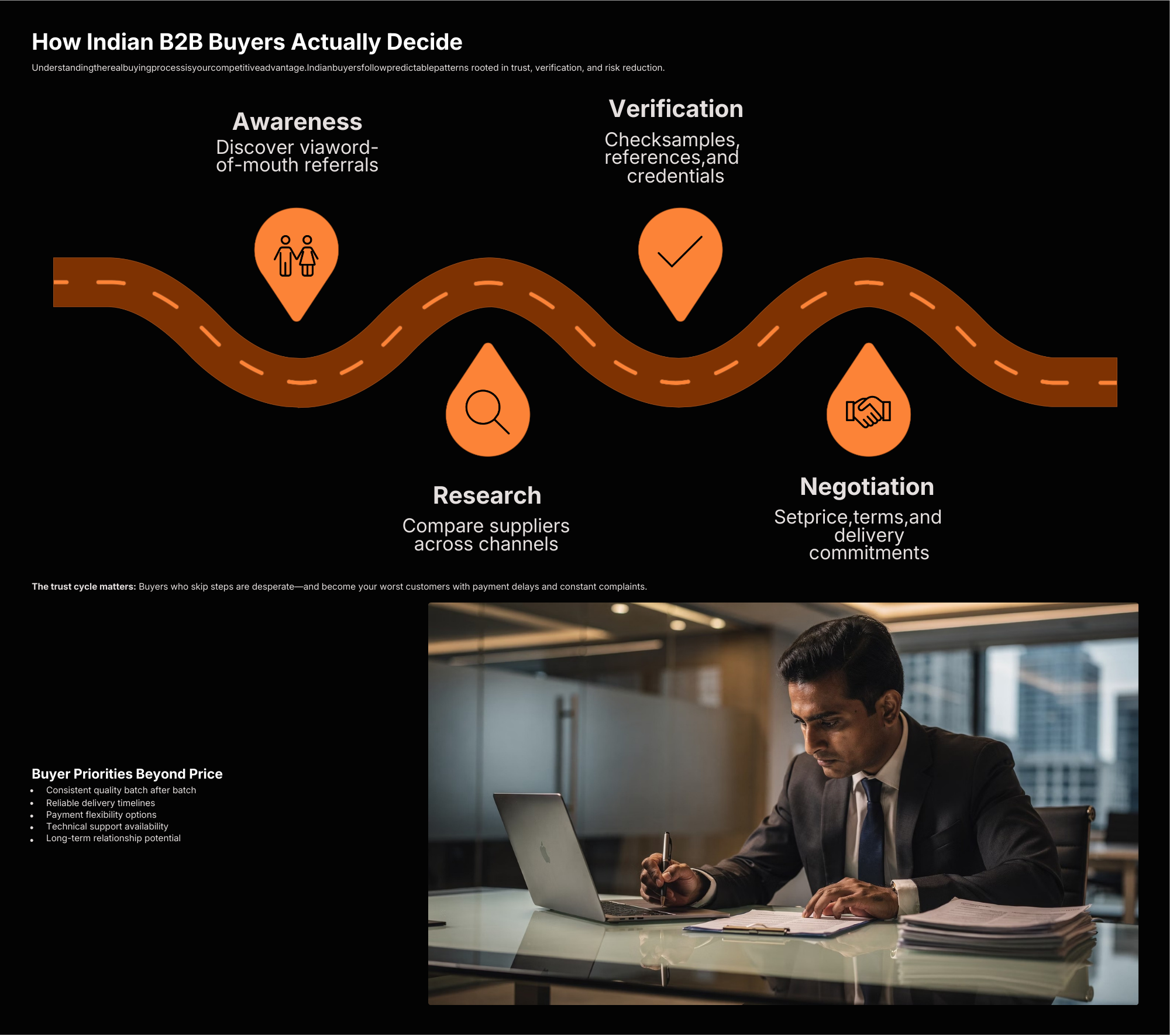 Inside this guide, you’ll learn how Indian B2B buyers actually make purchasing decisions — from awareness and research to verification and negotiation — and how to position your factory to win those deals. The system teaches manufacturers how to build strong positioning, create compelling B2B offers, implement smart pricing logic, and develop trust signals such as certifications, testimonials, and case studies that convert buyers into long-term partners.