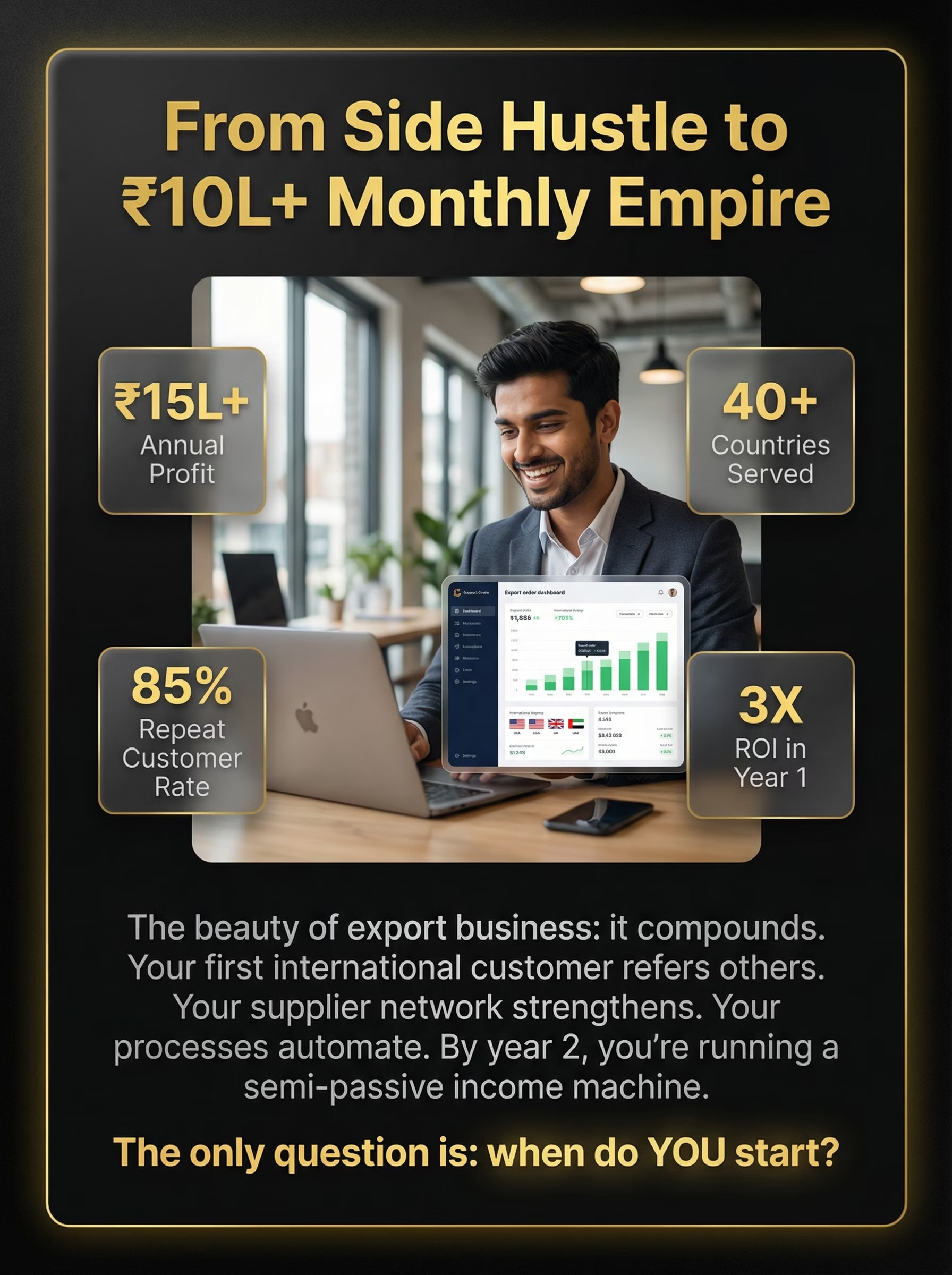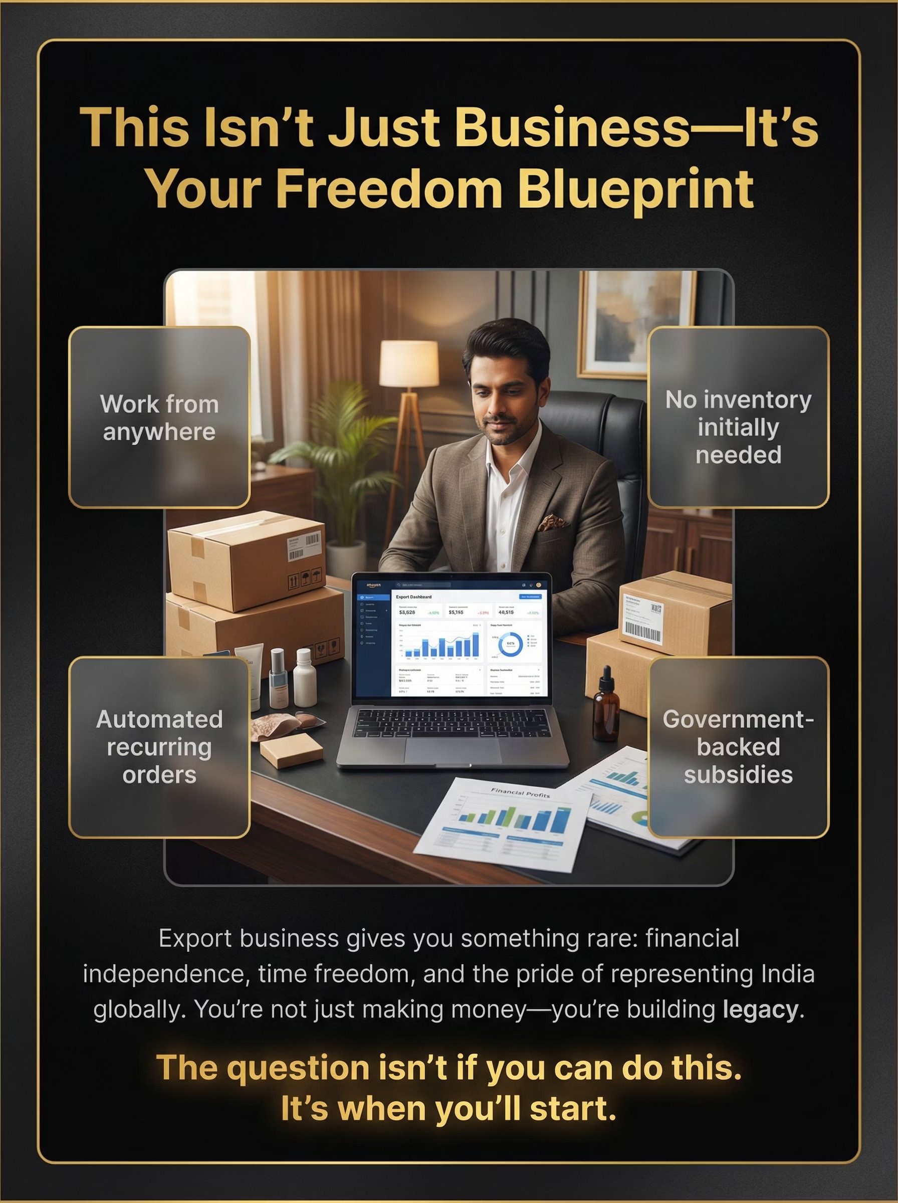 This Import–Export Business Plan is a wealth-multiplication model built on global price arbitrage. By sourcing Indian products and selling to international markets, exporters unlock higher margins, repeat orders, and foreign currency income. This plan shows how to start lean, validate fast, and scale globally—without owning factories.