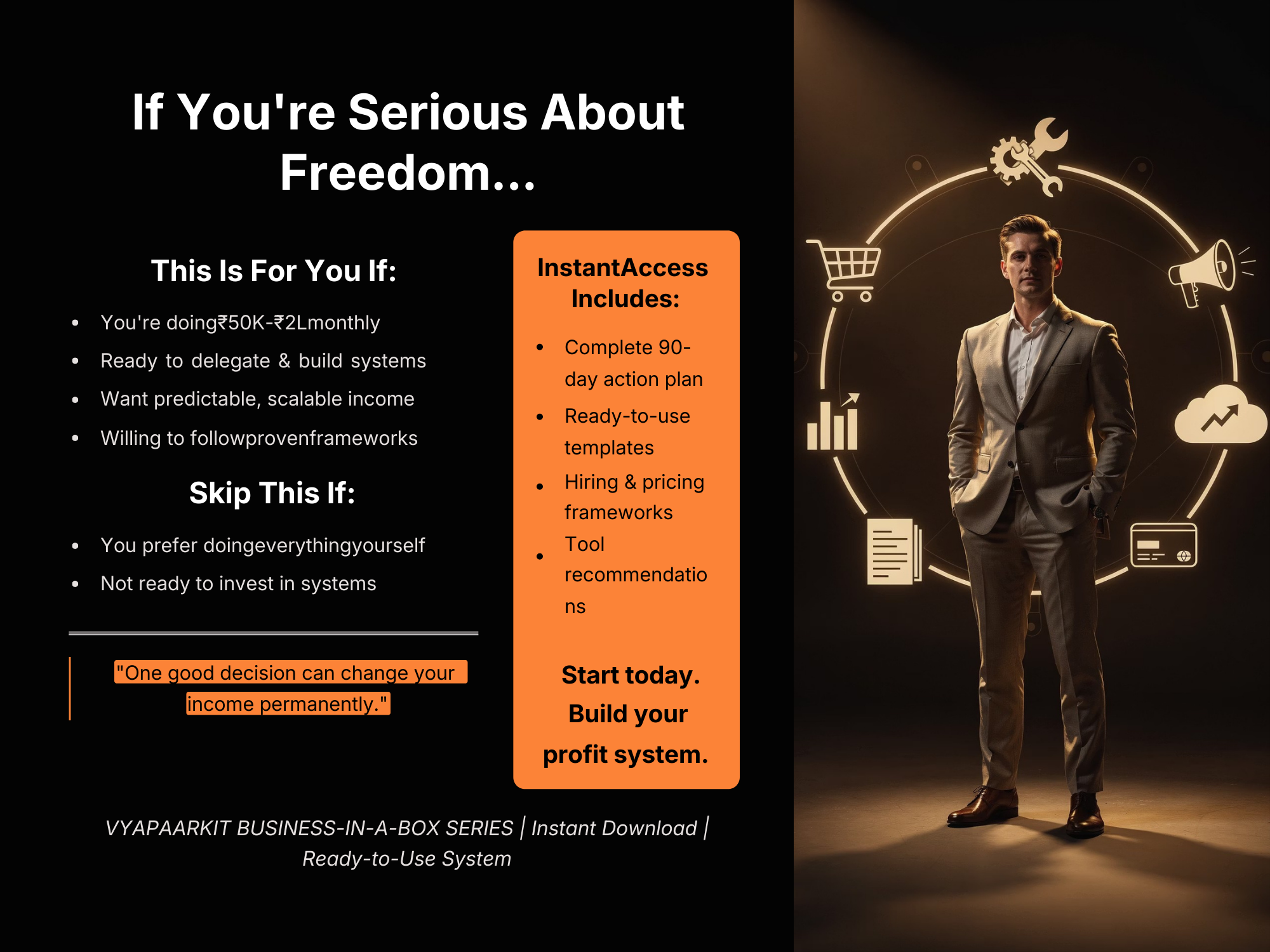 The Scale Beyond Solo: Systems & Delegation Blueprint by VyaparKit is a practical guide designed for entrepreneurs who want to move beyond doing everything themselves and build scalable business systems. Many founders remain stuck at ₹50K–₹2L monthly income because they handle every task alone, becoming the bottleneck in their own growth. This step-by-step blueprint shows you how to document processes, create SOPs, build a reliable freelancer network, and delegate work effectively while maintaining quality. Inside, you’ll learn how to design scalable workflows, hire on-demand talent, structure pricing for team-based delivery, and transition from a solo operator to a system-driven business owner. With a clear 90-day action plan, templates, and frameworks, this guide helps you stop trading time for money and start building a business that grows through systems and teams. If you want predictable income, freedom, and long-term scalability, this blueprint gives you the operational structure to scale confidently.