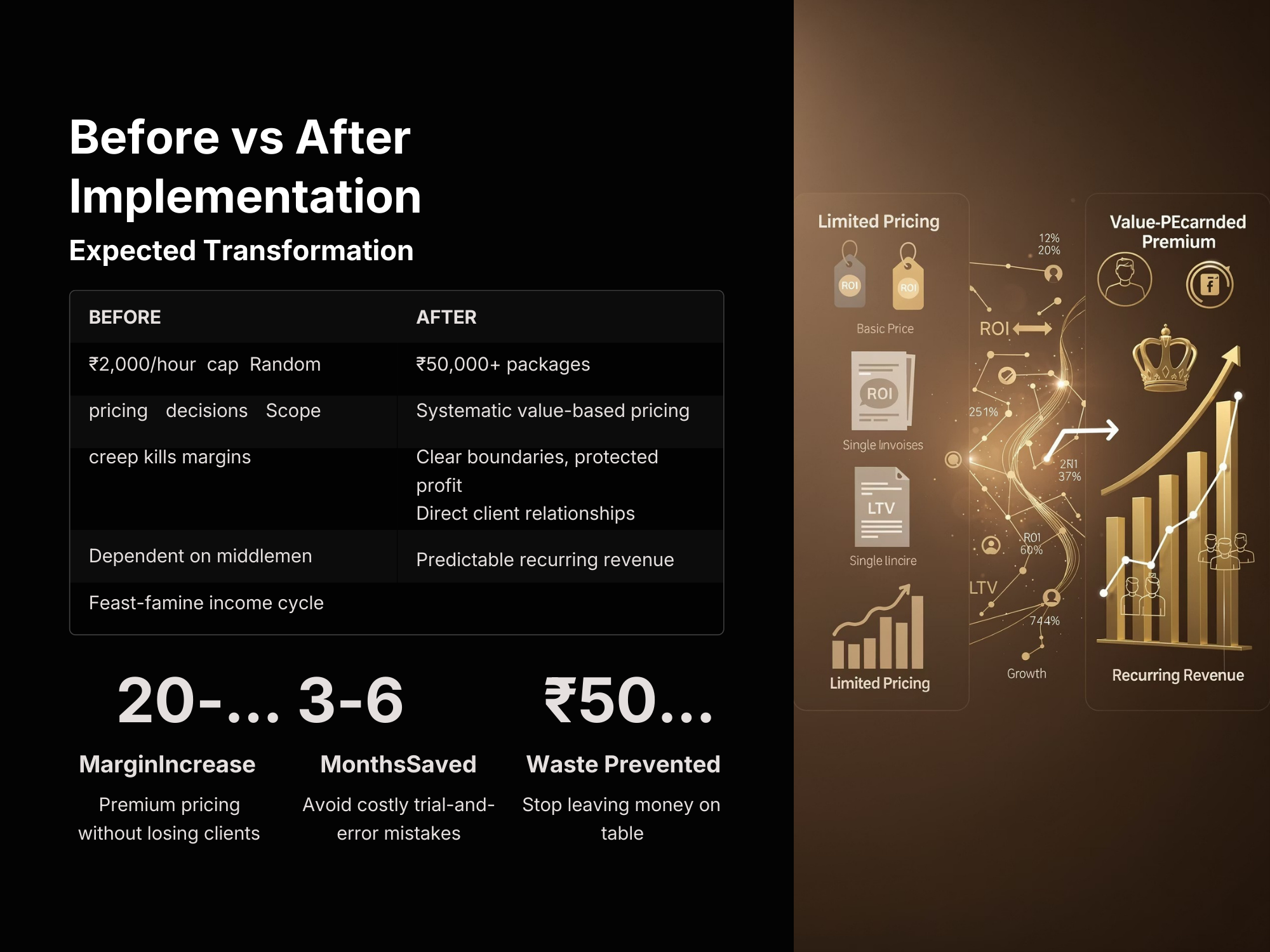 This VyaparKit pricing blueprint provides a clear, plug-and-play framework that transforms confusing pricing decisions into a structured profit system. Instead of charging hourly rates that limit growth, the playbook teaches value-based pricing, service packaging, and clear project boundaries that protect margins while increasing perceived value. It helps entrepreneurs design profitable service packages, eliminate endless revisions, and create pricing strategies that scale beyond personal time.