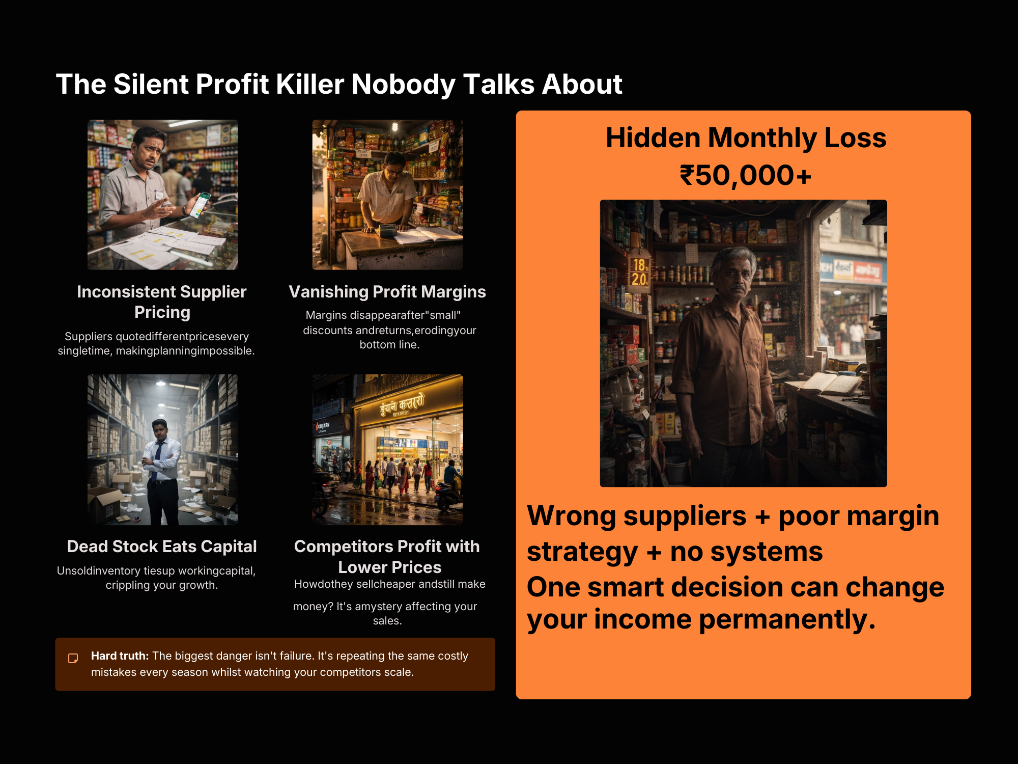 The Supplier Sourcing, Private Label & Margin Strategy Guide by VyaparKit is a practical system designed to help entrepreneurs and retailers increase profitability by choosing the right suppliers, negotiating better terms, and building strong private-label products. Many businesses struggle with inconsistent supplier pricing, shrinking margins, unsold inventory, and competitors selling similar products at lower prices. This VyaparKit playbook provides a structured approach to solving these problems by helping entrepreneurs build reliable supplier networks, create profitable pricing strategies, and implement systems that protect margins. Inside the guide, you’ll learn how to identify trustworthy suppliers, negotiate smarter deals, calculate true product costs, and develop private-label products that stand out in competitive markets. The toolkit also includes practical frameworks, margin calculators, supplier evaluation methods, and negotiation scripts designed specifically for Indian retail and D2C businesses. With the VyaparKit Supplier Sourcing, Private Label & Margin Strategy Guide, entrepreneurs can avoid costly sourcing mistakes, improve profit margins by up to 20–60%, and build scalable supplier systems that support long-term business growth.